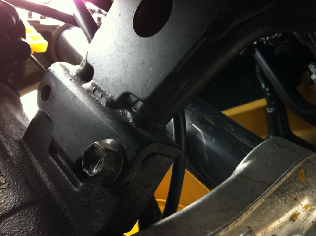 写真左側、これはフロントカウルフレームマウントなのだが、2本のボルト留のうち上側が何時の間にか旅立っていた