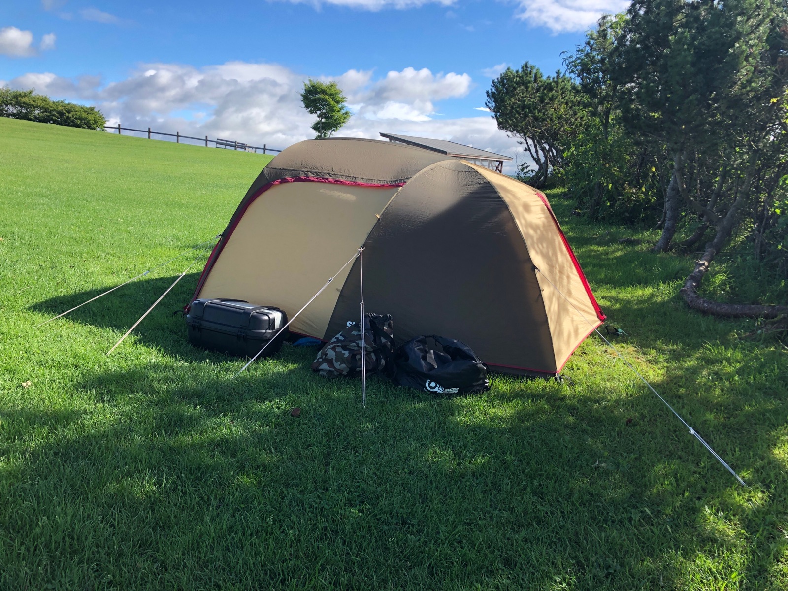 景色が良い代わりに吹き曝しの草原地での設営は大変だった